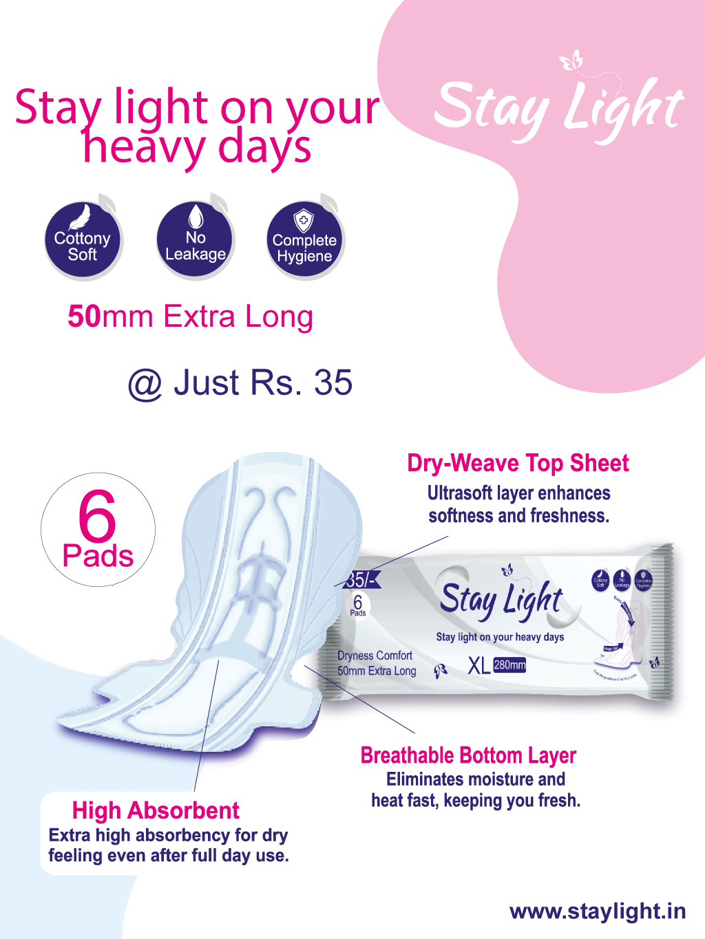 Periods are a sensitive time for every woman. Taking care of yourself must be a priority and StayLight Sanitary pads help you do that. These extra-long sanitary pads provide 100% protection from leakages. They are also chemical-free, which makes them skin-friendly as they stay in contact with your intimate areas for long periods of time.